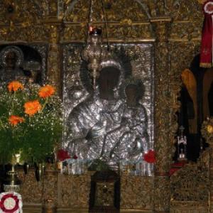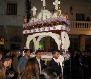 For Good Friday the "Epitaphios" or epitaph bed of Christ is part of a procession of icons, holy symbols and crosses that are brought out from surrounding churches to meet in the central square of Chora.